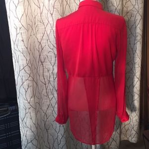 Free People bright red button down shirt. Top half is a soft material that feels like silk and the lower portion is sheer with a mermaid tail back. Great for any occasion with jeans, leggings or shorts.