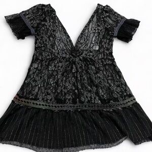 Vintage Free People sheer top lace dress/tunic with beading across layered skirt and frill sleeves