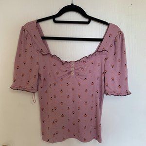 Free People, lavender, print top, small, square neck, button detailing, good condition, 95% rayon, 5% spandex.