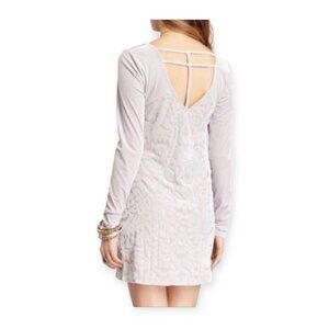 Chic and stylish Free People velvet mini dress in silver, featuring elegant back cutouts and long sleeves. This dress, size M, combines classic and modern design elements for a versatile look.