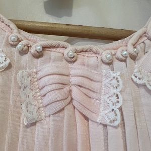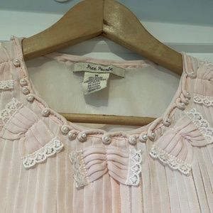 The sweetest Free People pink top! Size Medium, but I would say it is a small fit. It is approximately 19.5" long and 15.5" across the chest. The front is pleated and the back is sheer. The collar has beautiful detailing with Faux pearls and bow-type appliqués with lace edges. So cute! Wear with jeans, black pants, shorts, skirts--anything!