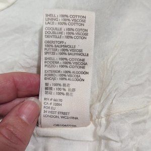 Beautiful white lace dress with elastic shouldered sleeves, rouched center front with adjustable bust tie, shirred back, invisible side zipper, crepe cotton skirt with lace around the bottom
