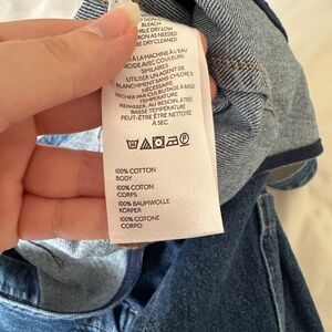 Features: Denim fabrication, low scoop neckline, seam detail throughout, oversized patch pockets, drop-crotch harem-style legs, low back with adjustable shoulder straps