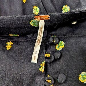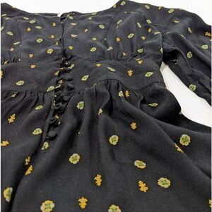 Bloused bateau neck bodice with off shoulder oversized full length sleeve that moves into a fitted buttoned cuff. Plunging keyhole center front, fitted waist, loose gathered bloused shorts. Center front button & loop closure.
