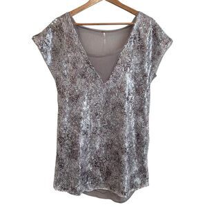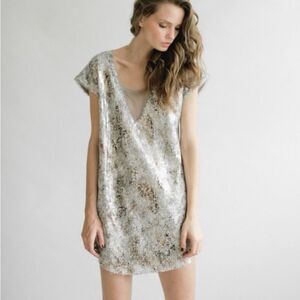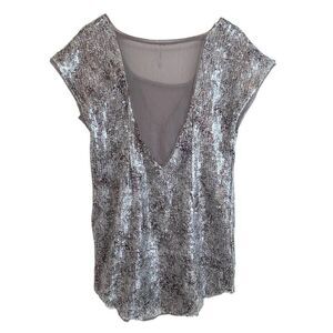 In very good condition. Free People Midnight Dreamer Shattered Glass Mini Dress. This gorgeous shimmering mini dress with raw hem is in a silver with cream undertones. It has short sleeves and a mesh v neck in the front and a deep v in the back. Sparkling and sexy, this dress is great for parties, festivals etc. There is a rip as pictured in the lining. Flat lay measurements: 17" pit to pit, 34" length.