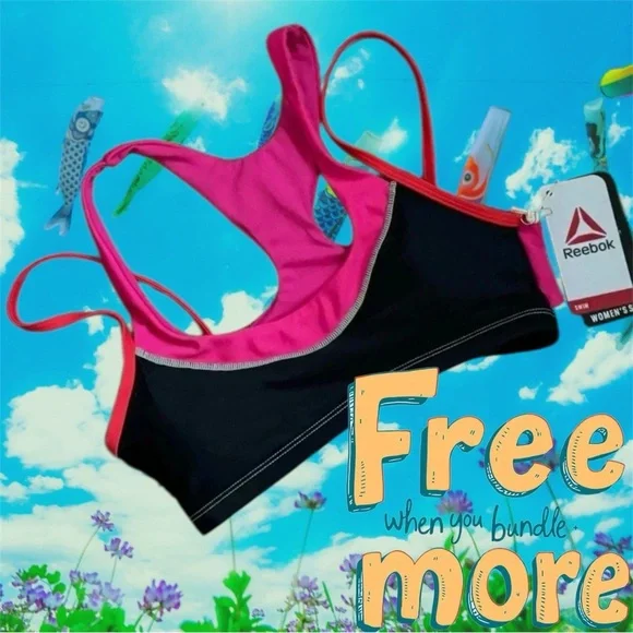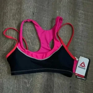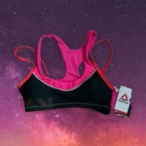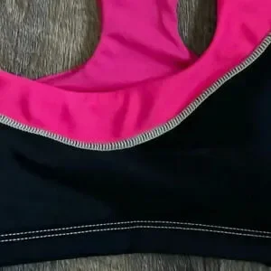 Black and pink colour block, strappy racer back with removable bra pads. Polyester/Spandex fabric. Ethically made with recycled polyester.
