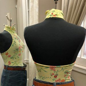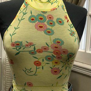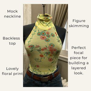In a mood-boosting shade of yellow with delicate floral print, this sexy backless and sleeveless top is an ideal item upon which to add on-rotation staples, from sleek blazers to laid-back denim jackets. It is cut for a figure-skimming fit in a lightweight material and has a mock neckline.
