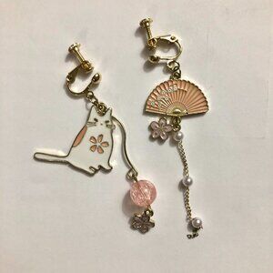 Adorable asymmetrical sakura/cherry blossom-themed clip-on earrings featuring a white+pink cat and folding fan. Purchased from UneRoseJewellery on Etsy
