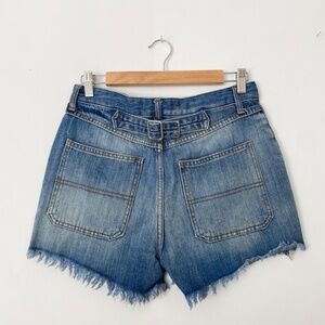 Button fly. 4-pocket styling. Intentionally distressed areas. Faded areas throughout. Frayed leg openings, belt detail at back.