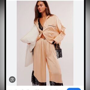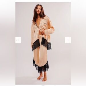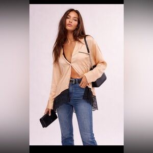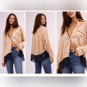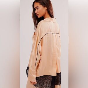 Features: Silky fabrication, collared neckline, button-front closure, contrast piping, long dolman sleeves, lace trim