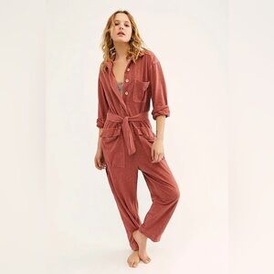 So comfy button-up onesie, perfect for lounging featuring a slouchy silhouette and a belted tie waist.