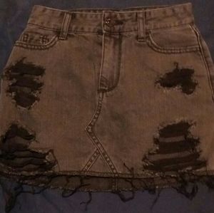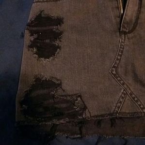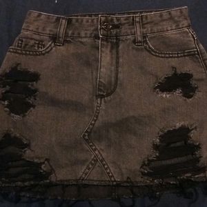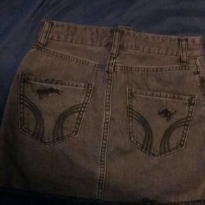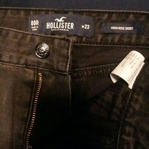 Distressed, black, high-rise, Hollister California denim mini skirt that is the PERFECT length (meaning- doesn't ride up when you sit down, doesnt show your butt when you bend over or walk up stairs)! Comfy, sexy, cute!