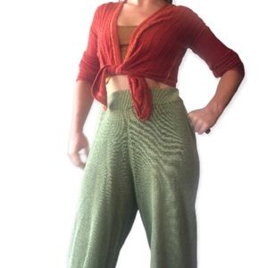 Ribbed sweater cardi featuring contrast stitch detailing and an open and adjustable tie front. Cotton/Linen blend. Colour “Chili Flame”
