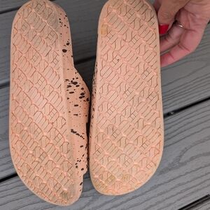 The Freedom Moses Angie is a unisex, two-band slide sandal made from PCU plastic, a material that is waterproof, washable, and lightweight. It features a slip-on design with a non-adjustable buckle closure, a molded footbed, and a non-slip, waterproof sole. The Angie slides are available in a variety of colors, including a black glitter option, and are infused with a milk and honey fragrance
