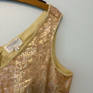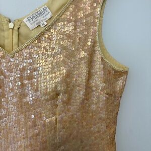 Vintage handmade sequin tank top by Freesia (Vancouver / Los Angeles). This eye-catching sleeveless blouse features gold sequins throughout, a deep V-neck in front and back, and detailed seed bead trim at neckline and hem. Fully lined with back zipper closure. Made in India, labeled size XL.
