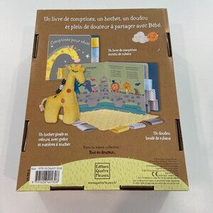 This French gift set features a storybook, plush giraffe rattle, and soft blanket. Ideal for early learning and sensory engagement for infants.