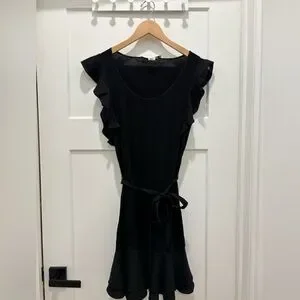 This elegant black dress features stylish ruffle details, perfect for any occasion. Its classic design ensures a timeless look. Has waist tie, can be worn with or without for faltering waist. Never worn. Size 6 fits a small.