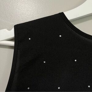 Sleeveless sheer black front panel with petite diamond rhinestones. Black solid back panel with stretch. Keyhole back with button closure.