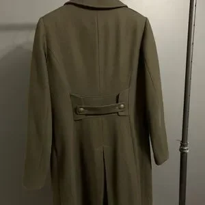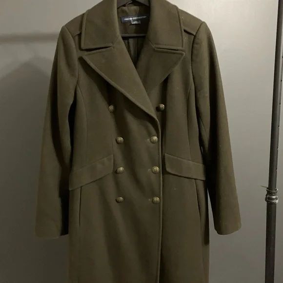 Olive Green French Connection Coat with Gold Hardware. 60%Wool, 30%Polyester, 10%Viscose. Dry Clean Only. Can take more photos upon request.