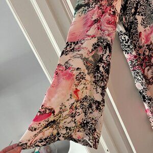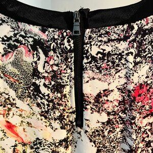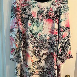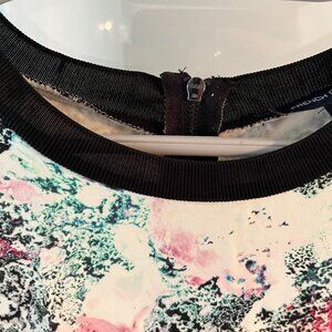 This French Connection (FCUK) babydoll/oversized dress is in very good condition, worn twice. It features a white and multicoloured design with pink, turquoise, and black splatter patterns. The dress has 3/4 sleeves and a black zipper at the back.