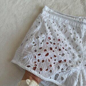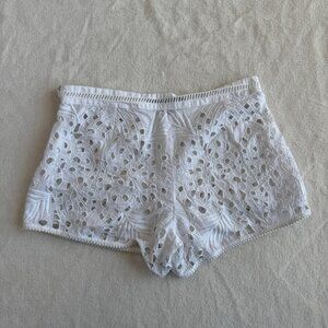 french connection white eyelet lace sheer shorts / swim cover up. hook and zipper closure at side