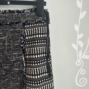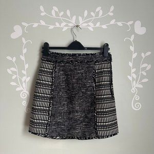 French Connection Jacquard Tweed Mini Skirt - gently worn! Black and white. Fringe detail at hem, waist, and throughout.