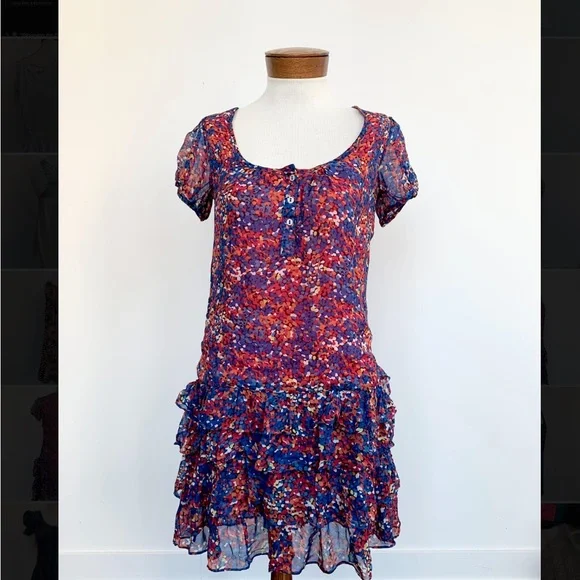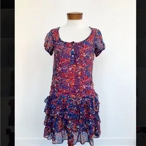 Vibrant mini dress with playful ruffles. Features a multicolor pattern. Ideal for casual outings.