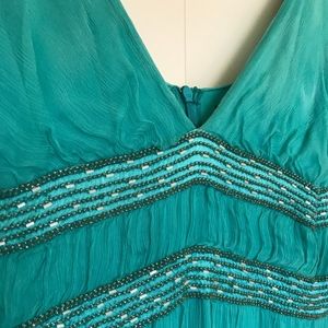 Turqouise dress, with sequinned details, has been resized so it fits like an 8. Very comfy and flown dress, great for a wedding or any other special occasion. Dress is in great condition, has no stains or visible damage.