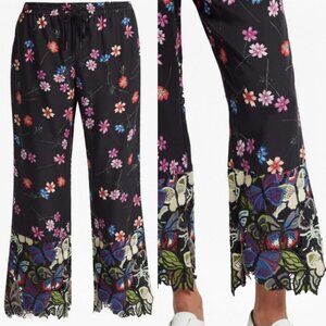 These wide-leg Botero Trousers are a chic pick, mixing a sporty elasticated-waist design with ditzy florals and pretty butterfly lace. Complete the look with a simple tee or camisole and sandals. description