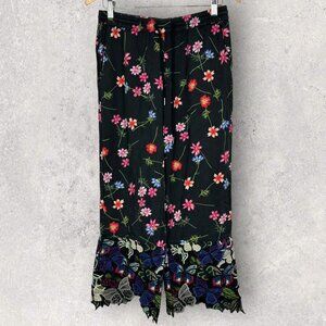 French Connection Lace Mix Trousers in Women's Size 2. These wide leg crochet floral pants are super boho and comfortable. Featuring classic floral print with delicate lace detail hem, in a cropped finish and relaxed fit, elasticated tie-waist, for effortless comfort and style this season. Slant pockets. Elastic waist with drawstring closure. Made in China. 100% lyocell.