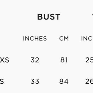 UK size 8/ XS. Sizing fits the chart pretty well.