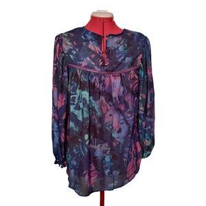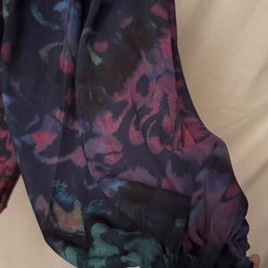 This wide flowing blouse is stunning! The beautiful multi colours is a statement piece with lace under Décolleté and just above breast line, making it humble sexy! Baggy sleeves with comfy elastic wrist adds body to the design. Though it is labeled as xs it should be marked on size fits all. Shoulders fits perfectly on a size 8 medium and very spacious, which could fit a large or even during pregnancy. It's hassle-free polyester easy wash and wear also wrinkle free. The perfect throw on to feel comfortable and look fabulous! Brand new unworn! United Kingdom brand AKA FCUK Britain $68 Euro = $123 plus taxes & duty!
