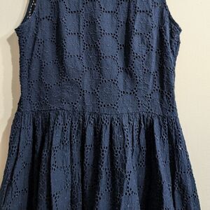 Navy Blue Dress, Eyelet Dress, Lace Dress, Sleeveless Dress, Fit and Flare, A-Line Dress, Midi Dress, Knee-Length Dress, Summer Dress, Spring Dress, Casual Dress, Everyday Dress, Brunch Dress, Cotton Dress, Womens Dress, Circle Skirt, Textured Fabric, Breathable Fabric, Feminine, Classic, Preppy, Bohemian, Vintage Inspired