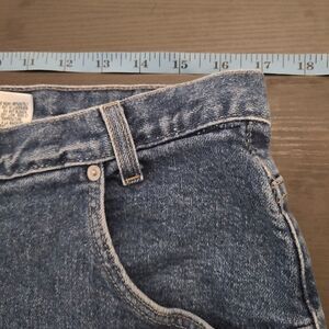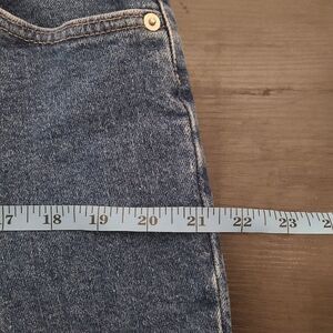 French Dressing Petite Natural Fit vintage style high waisted, blue denim jeans with straight tapered leg and no back pockets. Natural style fit. 2% Spandex stretch. Size 16 petite.
