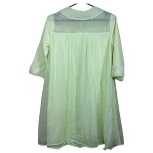 A vintage-style peignoir dress, from the brand French Maid, in a light, lime green color. Peignoir is a type of nightgown and robe set, likely from the 1960s. The peignoir appears to be made of sheer fabric like chiffon, consistent with vintage lingerie. It features a rounded collar and a central front opening. The bodice area is adorned with intricate white lace detailing, including a horizontal lace band across the chest and vertical lace accents. The sleeves are three-quarter length and also feature lace trim at the cuffs, creating a coordinated look with the bodice lace. The peignoir has a flowing silhouette, characteristic of vintage lingerie designed for comfort and elegance.