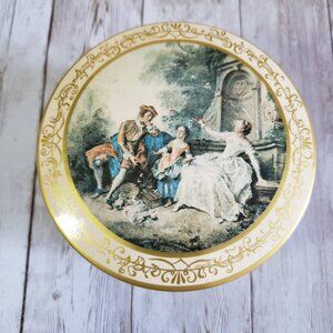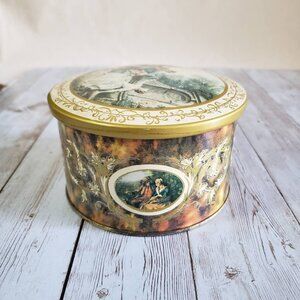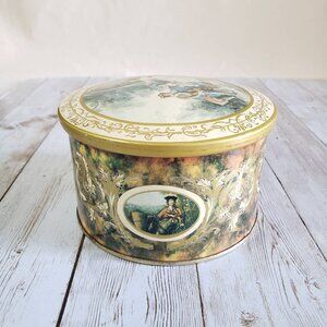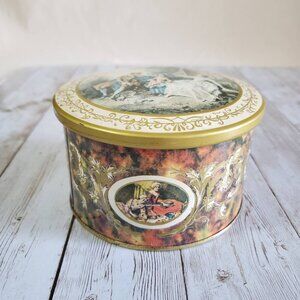 French Style Metal Chocolate Box or Cookie Tin Circular Round Can with Lid Bougie Family Scene
