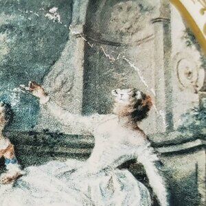 There are several scratches, including on the face of the woman on the right. Someone has written their name in red permanent marker on the bottom. Minor rust around the bottom rim. Please view all photos for details.