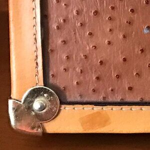 This beautiful ostrich leather case has smooth leather trims and all the bells and whistles. Minor areas on the trim present natural patina.