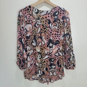 Lovely sheer viscose rayon 3/4 sleeve blouse from French Connection with a fun abstract pattern in pinks peaches taupe and black and white.