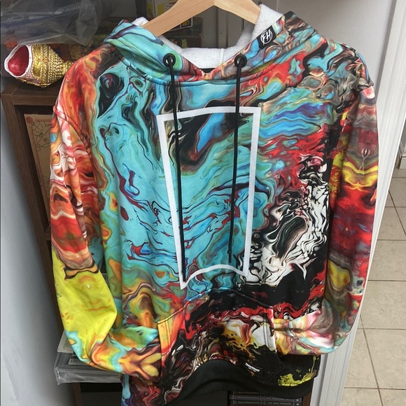 Vibrant hoodie with abstract swirl design. Features a mix of blue, red, yellow, and black colors.