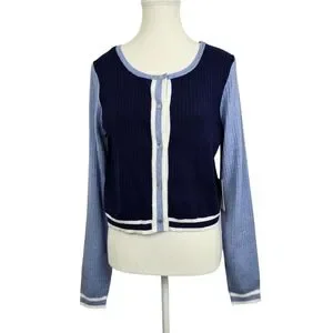 Trendy Freshman 1996 women’s button-front cardigan featuring a flattering ribbed knit texture and eye-catching color-block design.