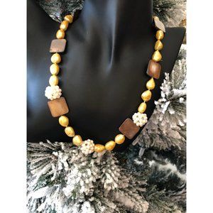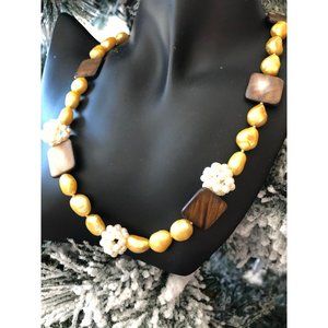 Lovely choker style necklace with golden dyed baroque freshwater pearls, square brown glass stations and 3 clusters of white freshwater pearl stations. Has a 10mm rectangular lobster clasp closure. Measures 19" in length. Strung on silk cord, hand knotted. In very good vintage condition. No returns or exchanges.