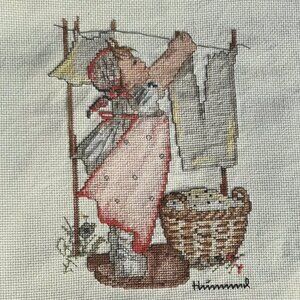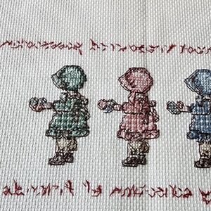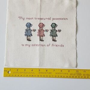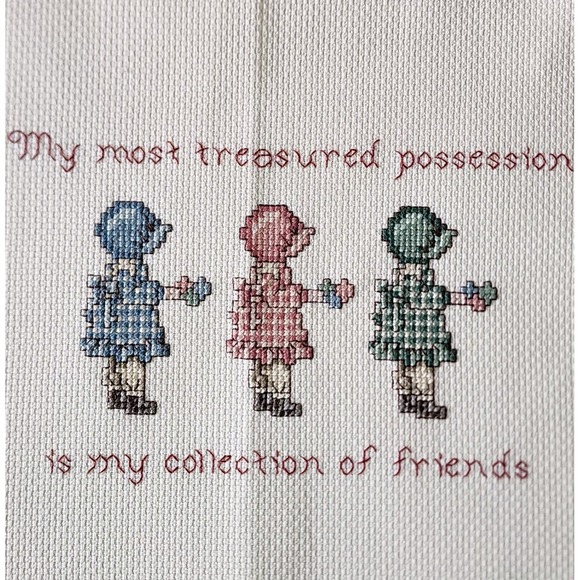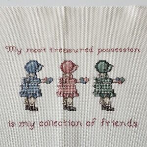 This handmade cross stitch sampler features the heartwarming message "my most treasured possession is my collection of friends". The beautiful cottagecore design includes three friends in bonnets surrounded by text.
