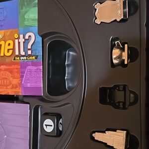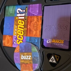 Friends Scene It Game. Box is opened but game hasn't been played buzz cards still sealed. The only flaw is one metal mover (the chair) is missing. So only 3 players get a Friends metal mover.