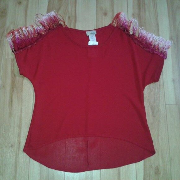 Fringed top on side sleeves. Rounded hem, longer at back. Brand : Palacio. Fabric : 100% polyester. Color : Red and white Size: S.
