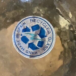 This is an attractive and versatile piece to store grains, seeds, herbs - or even garlic. There is a nicely detaled open work piece of pewter depicting herbs and garlic on one face.There are some tiny bubbles in the sea-green glass, adding to an overall artisanal look. The container measures about 4X4 inches at the base and stands about 6 inches high. The cork stopper is about an inch think, with a diameter of just over 3 inches, narrowing to about 2-3/4 inches. Stickered on the bottom: "Recycled Glass" and "Handmade in Spain". In excellent condition.