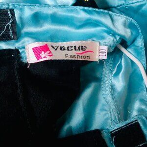 Design: Long-sleeved satin-style turquoise top with attached black velvet-style bodice decorated with floral and golden trim. Blue skirt with floral details.