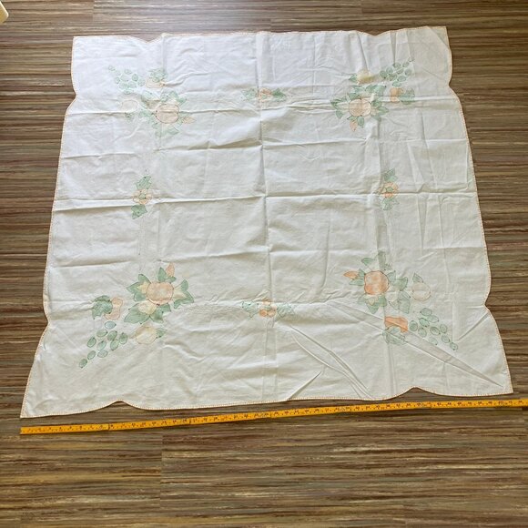 Vintage white cotton tablecloth has hand painted fruit motif outlined with hand embroidery. Has yellow stitching around the edges. Approx. 48x50" with scalloped edges. Pre-owned condition: white cotton has several yellow discolorations and spots from use, see close-up photos.