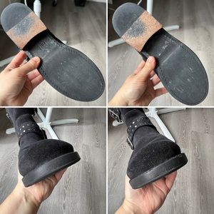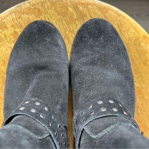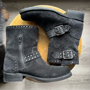 Gorgeous suede Frye boots ready for your closet! Frye Vicky stud engineer black short boot in like new condition. These are showing up lighter in the photos - they are darker in person! Not studs missing or loose. Barely any signs of wear on sole and heel. I just don’t reach for them as much as I’d like! All metals are in pristine condition and zippers are metal. Leather still smells fresh! Only flaw I can see if a little lift in the part of the shoes where the bottoms are sewn together, as shown in last photo. Slight scuffing on top of shoes as shown. No flaws inside boots. Smoke free dog friendly home.