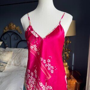 Japanese cherry blossom print fuchsia slip and robe, size M. 65% silk, 25% cotton, 10% fibre (?). I don't know how much is real silk but it feels very nice. Bust of the nightie measures 17.25 inches laying flat, average length (has adjustable straps) is 34.5 inches. Length of robe is 36.5 inches. Cat friendly, nonsmoking home.